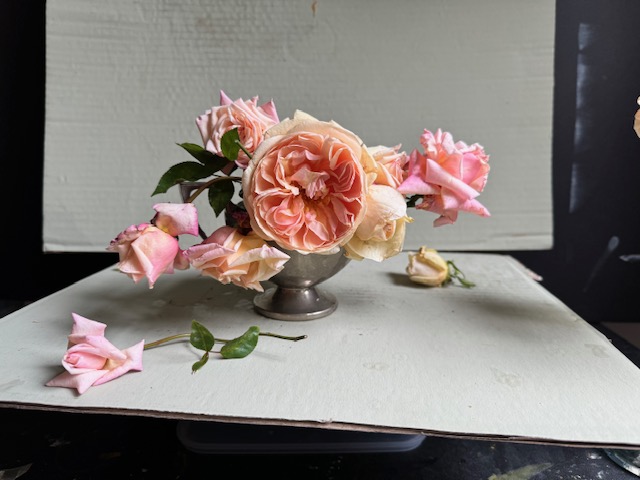 Indoor easels, tables, lights, vases, flowers, oil paints, mediums, solvents, palettes, and painting surfaces.