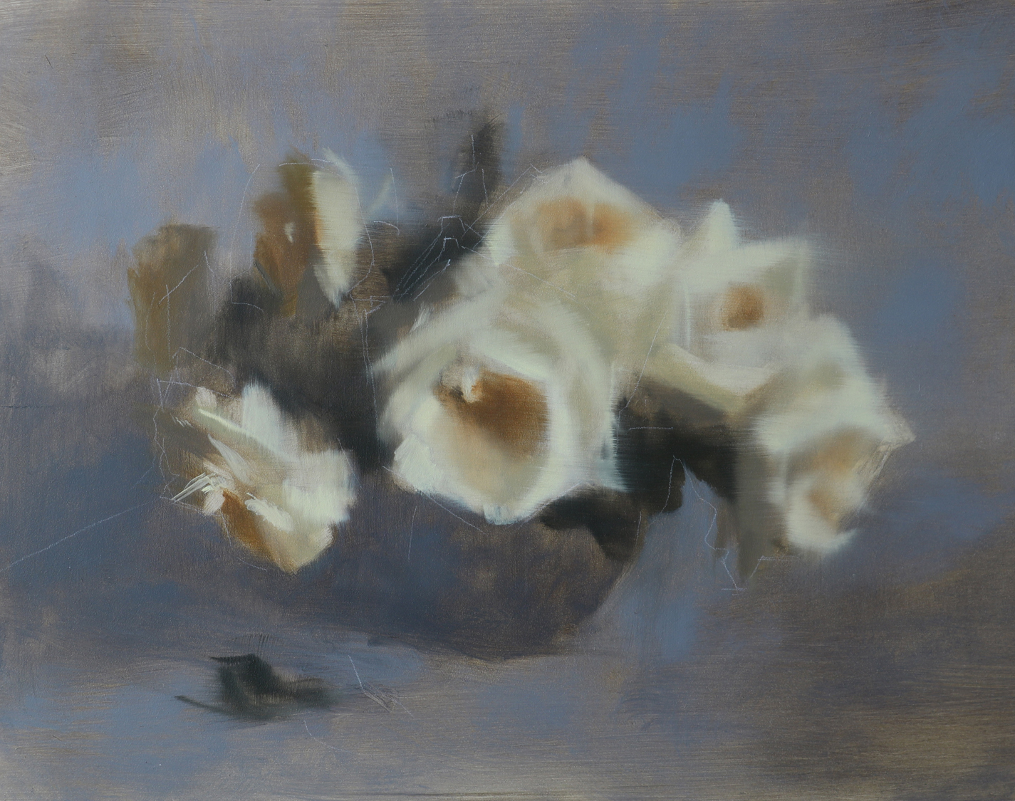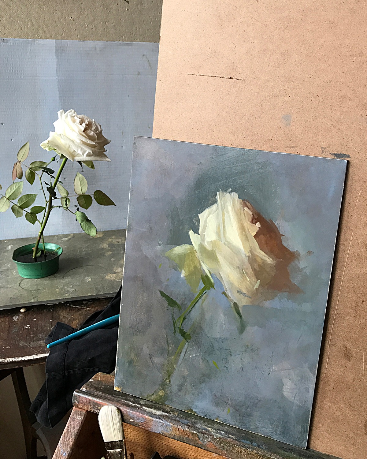The painting to the right shows where Class 5 left off. Note the faint white chalk marks on the surface of the painting. Although the chalk will dissolve with the Gamsol wash, Kathleen will show you how to use the marks to identify elements you may want to change in your painting.