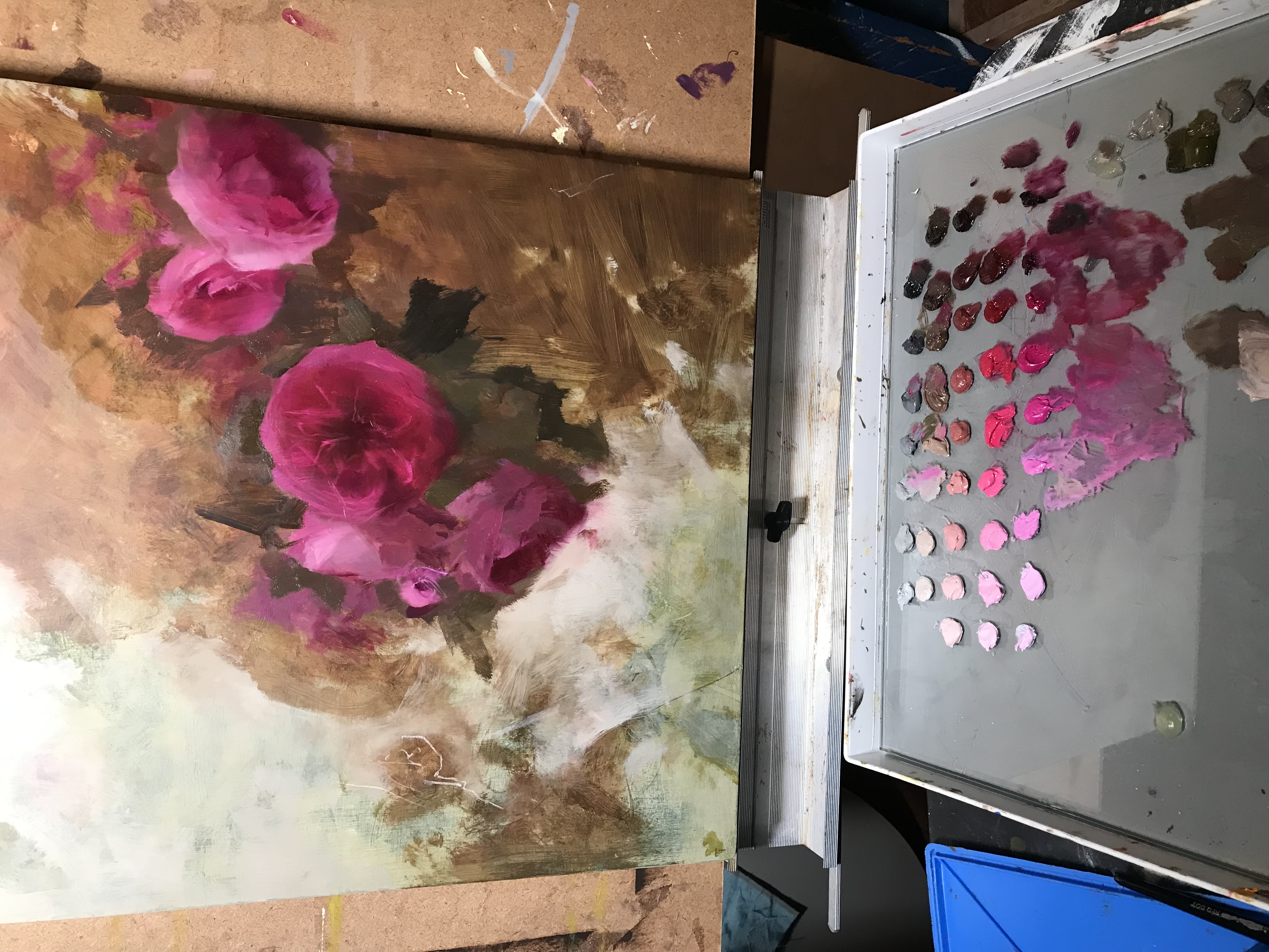 Color Strings Workshop, this class goes deeper into the effectiveness of the method. In both sessions, Kathleen works from a still life with roses. Using a premixed palette allows for a fluid interpretation of the subtleties of this challenging subject.